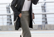 화이트 티셔츠 + 그레이 체크 자켓 + 그레이 팬츠