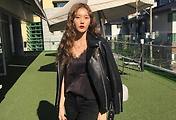 블랙 티셔츠 + 청 스키니진 + 화이트 스니커즈